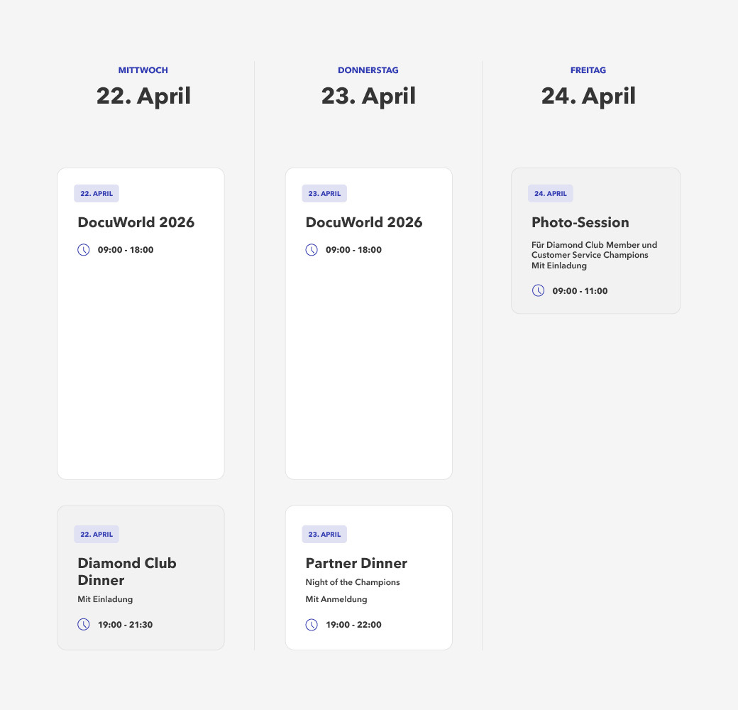 DocuWorld Partner Conference 2024 (EMEA) - jetzt anmelden!Es ist wieder so weit! Vom 25. bis 26. April öffnet die DocuWorld Partnerkonferenz 2024 ihre Pforten. Unter dem Motto "Shaping Tomorrow" werden Sie wieder in die neuesten Technologien und Lösungen aus dem Bereich Dokumentenmanagement und Workflow-Automatisierung eintauchen.