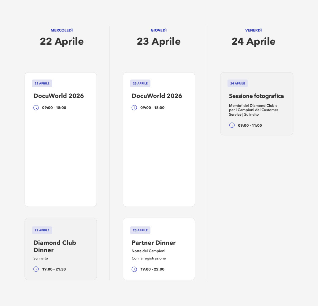 Conferenza dei partner DocuWorld 2024 (EMEA): iscriviti subito!È di nuovo il momento dell'anno! La DocuWorld Partner Conference 2024 aprirà i battenti dal 25 al 26 aprile. Con il motto "Shaping Tomorrow", ancora una volta sarete immersi nelle più recenti tecnologie e soluzioni nel campo della gestione dei documenti e dell'automazione dei flussi di lavoro.