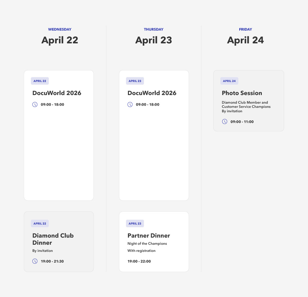 DocuWorld Partner Conference 2024 (EMEA) – register now!It's that time of year again! The DocuWorld Partner Conference 2024 will open its doors from April 25 to 26. Under the motto "Shaping Tomorrow," you will once again be immersed in the latest technologies and solutions from the field of document management and workflow automation.
