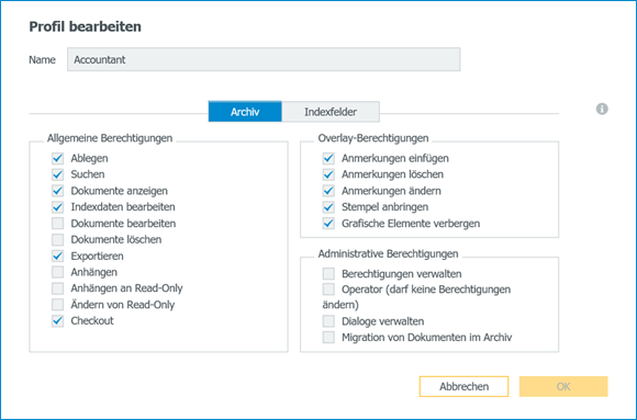 Prinzipiell, und wenn Sie mit mehreren Archiven arbeiten, ist die Unterscheidung jedoch wichtig. Archivprofile legen Sie pro Archiv an. Ein einzelnes Profil steuert die Rechte innerhalb des entsprechenden Archivs. In Rollen können Sie mehrere Archivprofile zu verschiedenen Archiven bündeln. Über die Rollen statten Sie die Benutzer dann mit den gewünschten Rechten aus.