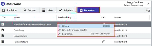 - Der DocuWare Client enthält nun einen speziellen Bereich für Formulare, so dass Anwender schneller auf die DocuWare-Webformulare zugreifen und diese ausfüllen können.