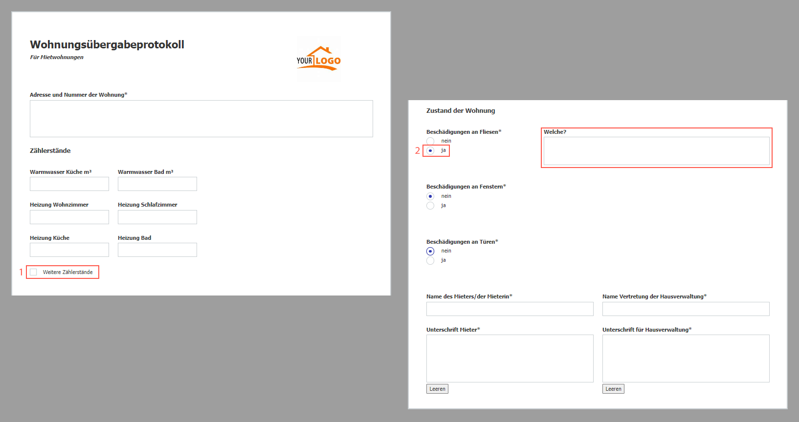 Beispiel für ein Wohnungsübergabeprotokoll als Webformular: Über die Option „Weitere Zählerstände“ werden zusätzliche Felder eingeblendet (1), die Felder für die Beschreibung der Beschädigungen werden nur angezeigt, wenn auch welche vorliegen (2). Pflichtfelder verhindern, dass Angaben vergessen werden (*).
