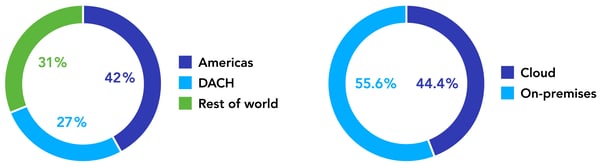 Unternehmen, die DocuWare Cloud einsetzen, verteilen sich über Nord- und Südamerika (42 Prozent) sowie die Regionen DACH (27 Prozent) und EMEA / RoW (31 Prozent). Im Jahr 2018 entschied sich wie schon im Jahr zuvor fast die Hälfte aller Neukunden für das SaaS-Modell im Vergleich zur On-Premises-Lösung.