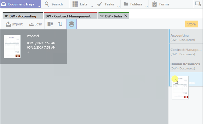 You can also move documents within DocuWare using drag & drop. For example, if a document has landed in the wrong tray, just drag it to the tab of the correct one and drop it.