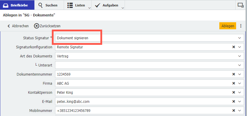 1. Das Dokument wird entweder direkt mit seiner Ablage ins DocuWare Archiv zur Signatur geroutet. Oder Sie leiten den Signaturprozess später mit einem digitalen Stempel ein.