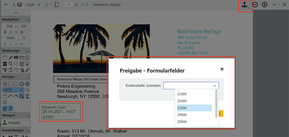 Wenn ein Mitarbeiter diesen Stempel im DocuWare Viewer auf ein Dokument anwendet, können nun alle Kostenstellen aus der Auswahlliste ausgewählt werden.