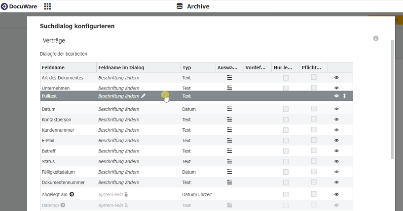 Unabhängig davon, ob es sich um den automatisch generierten Standard-Suchdialog oder einen neu erstellten handelt: Jeder Suchdialog enthält zunächst alle Datenbankfelder, die für das Archiv aktiviert sind. Dies können unter Umständen sehr viele sein, die in der Regel nicht alle für eine gezielte Suche benötigt werden. Um einen Suchdialog zu verschlanken, blenden Sie nicht relevante Felder aus, indem Sie auf das Augensymbol klicken. Außerdem können Sie die Reihenfolge der Felder per Drag & Drop einfach in eine passende Reihenfolge bringen. Platzieren Sie z.B. das Feld für die Volltextsuche ganz oben: