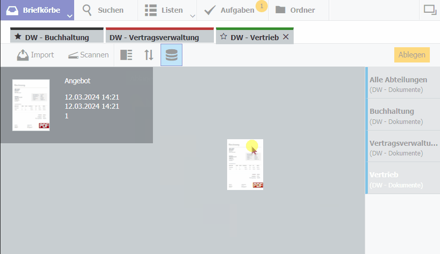 Auch innerhalb von DocuWare können Sie Dokumente per Drag & Drop bewegen. Ist ein Dokument beispielsweise im falschen Briefkorb gelandet, ziehen Sie es einfach auf den Reiter des richtigen Briefkorbs und lassen es fallen.